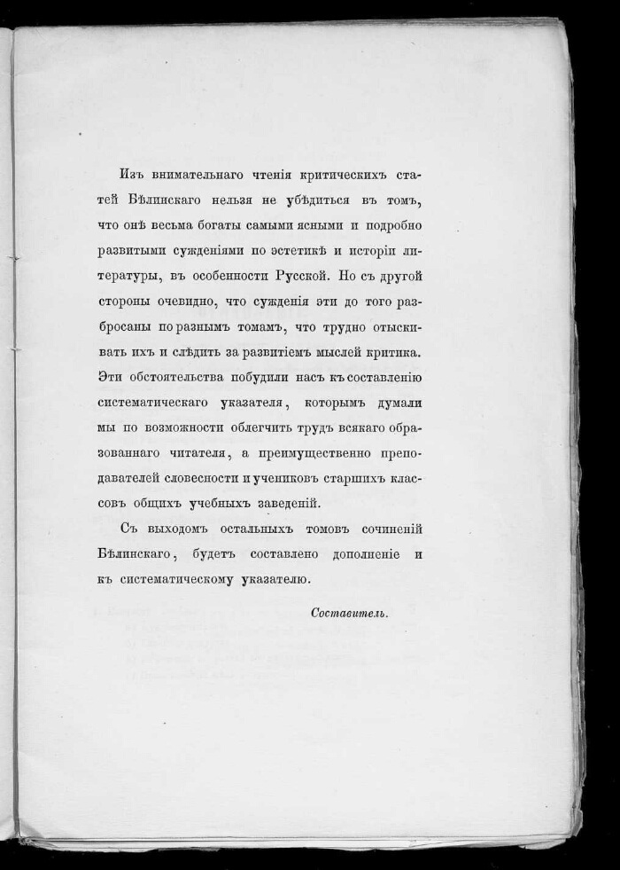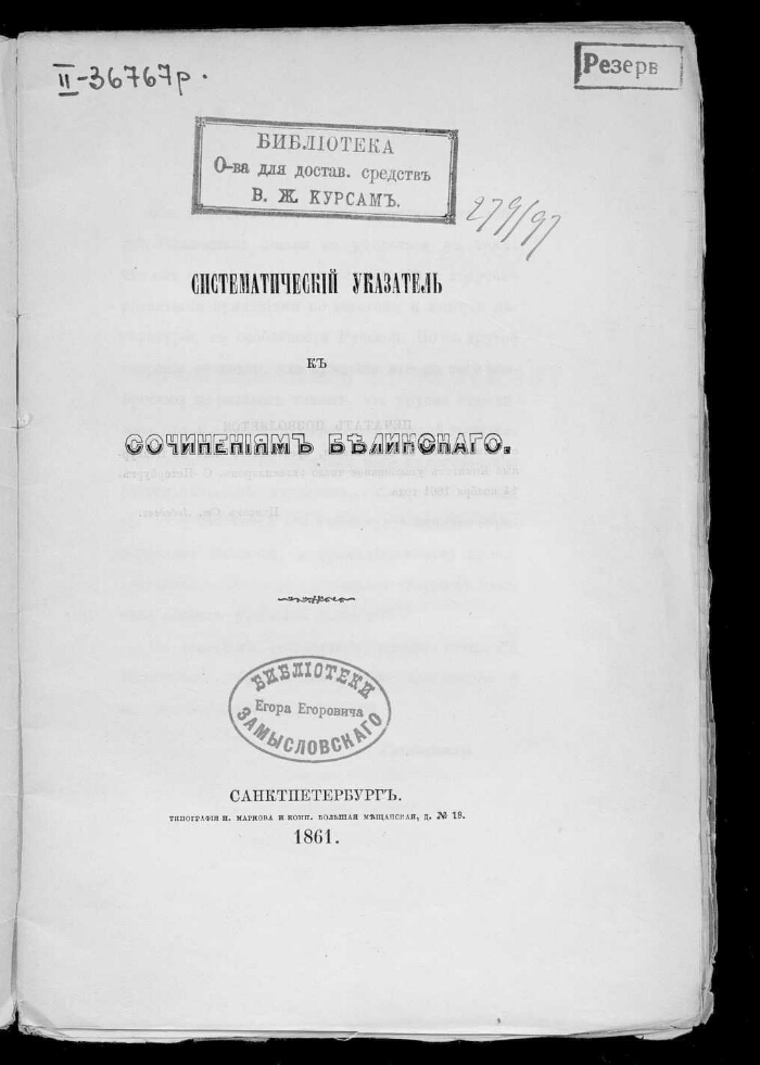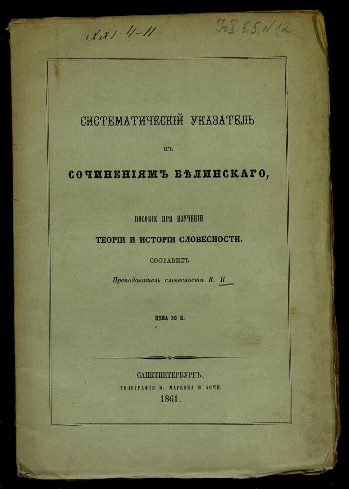 Систематический указатель к сочинениям Белинского : [пособие при изучении теории и истории словесности / составил преподаватель словесности К. П.]. - Санкт-Петербург : типография И. Маркова и К°, 1861. -[4], IV, 60, 16 с. ; 23 см. - В издании 1879 г. заглавие: Систематический указатель к сочинениям Белинского с присоединением соответствующих указаний на сочинения Добролюбова.
