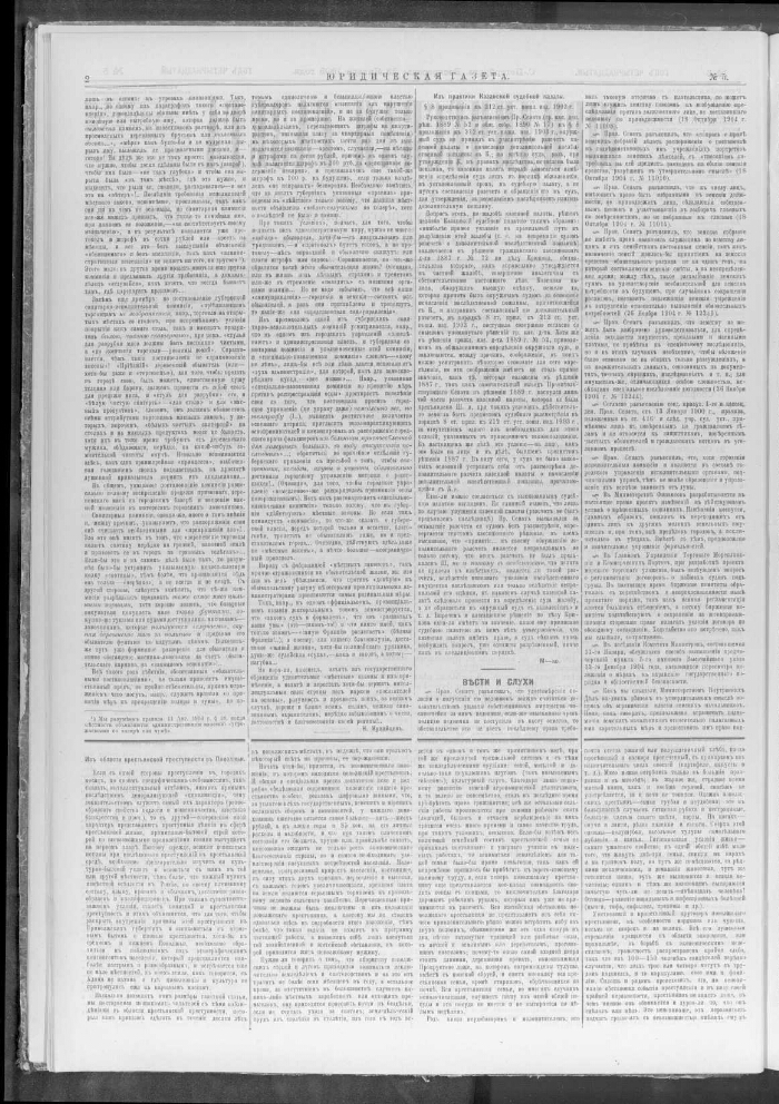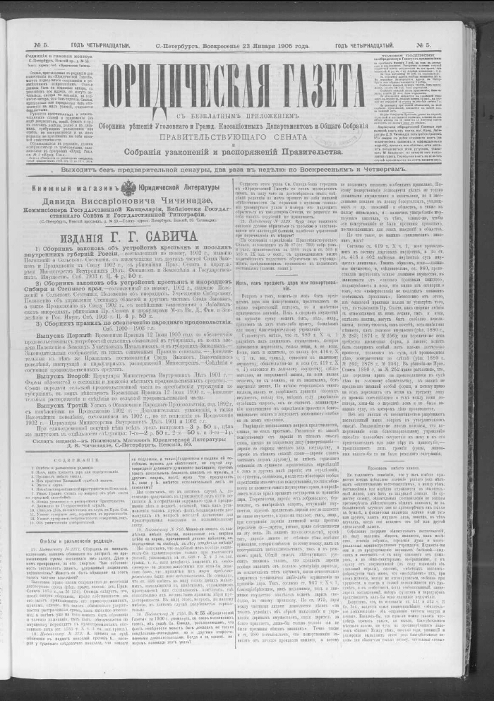 Юридическая газета : выходит без предварительной цензуры. - 1892, 4 января - [1906]. -Санкт-Петербург, 1892-1906. - "Юридическая газета" с бесплатным приложением Сборника решений Уголовного и Гражданского департаментов и общего собрания правительствующего сената, а с 1895 и Собраний узаконении и распоряжений правительства - выходила в Петербурге с января 1892 по 1906, 2 раза в неделю, по воскресеньям и четвергам. Редакторы - Е. Антонов, Д. В. Чичинадзе, М. В. Чичинадзе. Материалы газеты печатались под рубриками: Законодательная хроника в России, Обзор постановлений отечественного и иностранного законодательства, Статьи и заметки по вопросам, возникающим в судебной и административной практике, Корреспонденции из России, Выдающиеся судебные процессы, Речи известных адвокатов. С № 6 1906 стала выходить в виде брошюр. Алфавитный указатель статей за 1901 год: в № 32 за 30 декабря 1901 г.. - Алфавитный указатель к "Юридической газете" за 1892 и 1893 гг. - Санкт-Петербург, 1894. - Приложения: "Сборник решений Уголовного и Гражданского кассационных департаментов и Общего собрания Правительствующего сената" и "Собрание узаконений и распоряжений Правительства".