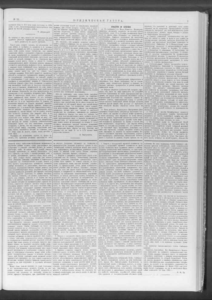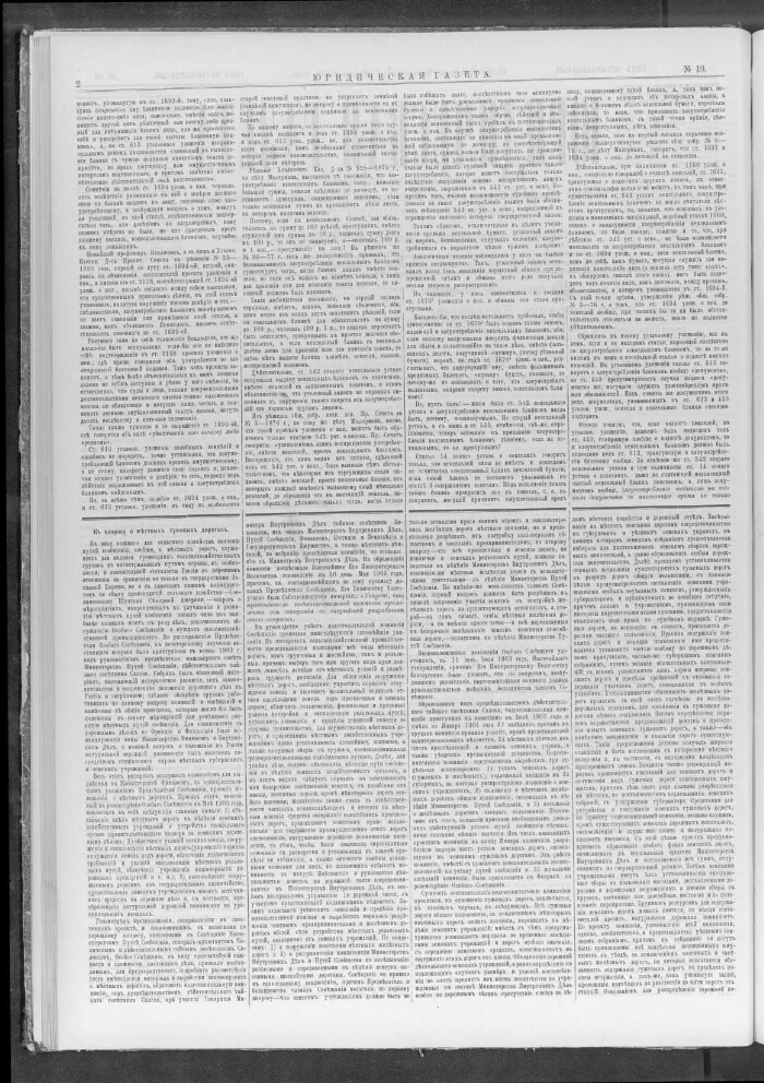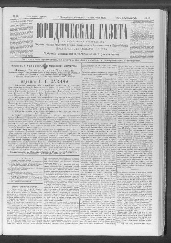 Юридическая газета : выходит без предварительной цензуры. - 1892, 4 января - [1906]. -Санкт-Петербург, 1892-1906. - "Юридическая газета" с бесплатным приложением Сборника решений Уголовного и Гражданского департаментов и общего собрания правительствующего сената, а с 1895 и Собраний узаконении и распоряжений правительства - выходила в Петербурге с января 1892 по 1906, 2 раза в неделю, по воскресеньям и четвергам. Редакторы - Е. Антонов, Д. В. Чичинадзе, М. В. Чичинадзе. Материалы газеты печатались под рубриками: Законодательная хроника в России, Обзор постановлений отечественного и иностранного законодательства, Статьи и заметки по вопросам, возникающим в судебной и административной практике, Корреспонденции из России, Выдающиеся судебные процессы, Речи известных адвокатов. С № 6 1906 стала выходить в виде брошюр. Алфавитный указатель статей за 1901 год: в № 32 за 30 декабря 1901 г.. - Алфавитный указатель к "Юридической газете" за 1892 и 1893 гг. - Санкт-Петербург, 1894. - Приложения: "Сборник решений Уголовного и Гражданского кассационных департаментов и Общего собрания Правительствующего сената" и "Собрание узаконений и распоряжений Правительства".