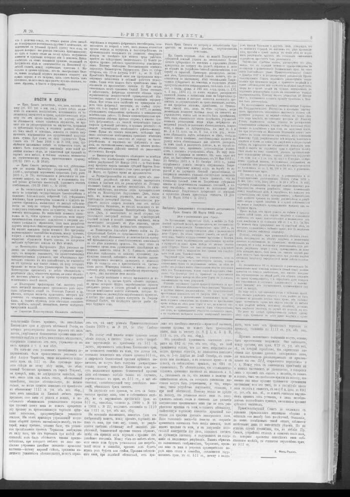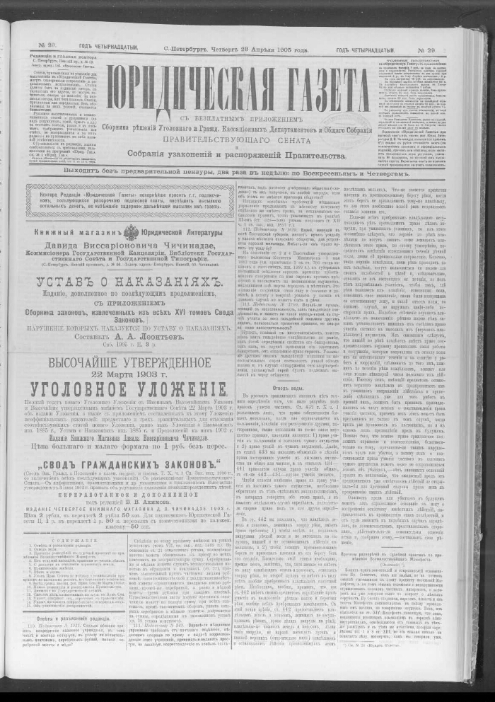 Юридическая газета : выходит без предварительной цензуры. - 1892, 4 января - [1906]. -Санкт-Петербург, 1892-1906. - "Юридическая газета" с бесплатным приложением Сборника решений Уголовного и Гражданского департаментов и общего собрания правительствующего сената, а с 1895 и Собраний узаконении и распоряжений правительства - выходила в Петербурге с января 1892 по 1906, 2 раза в неделю, по воскресеньям и четвергам. Редакторы - Е. Антонов, Д. В. Чичинадзе, М. В. Чичинадзе. Материалы газеты печатались под рубриками: Законодательная хроника в России, Обзор постановлений отечественного и иностранного законодательства, Статьи и заметки по вопросам, возникающим в судебной и административной практике, Корреспонденции из России, Выдающиеся судебные процессы, Речи известных адвокатов. С № 6 1906 стала выходить в виде брошюр. Алфавитный указатель статей за 1901 год: в № 32 за 30 декабря 1901 г.. - Алфавитный указатель к "Юридической газете" за 1892 и 1893 гг. - Санкт-Петербург, 1894. - Приложения: "Сборник решений Уголовного и Гражданского кассационных департаментов и Общего собрания Правительствующего сената" и "Собрание узаконений и распоряжений Правительства".