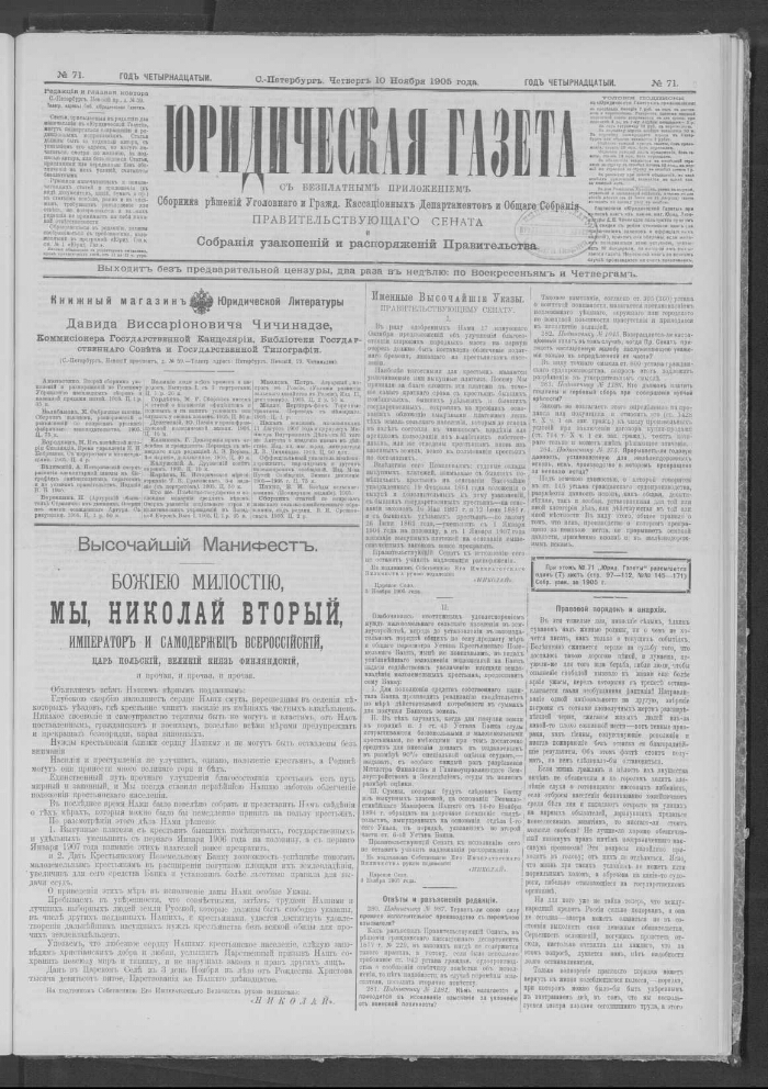 Юридическая газета : выходит без предварительной цензуры. - 1892, 4 января - [1906]. -Санкт-Петербург, 1892-1906. - "Юридическая газета" с бесплатным приложением Сборника решений Уголовного и Гражданского департаментов и общего собрания правительствующего сената, а с 1895 и Собраний узаконении и распоряжений правительства - выходила в Петербурге с января 1892 по 1906, 2 раза в неделю, по воскресеньям и четвергам. Редакторы - Е. Антонов, Д. В. Чичинадзе, М. В. Чичинадзе. Материалы газеты печатались под рубриками: Законодательная хроника в России, Обзор постановлений отечественного и иностранного законодательства, Статьи и заметки по вопросам, возникающим в судебной и административной практике, Корреспонденции из России, Выдающиеся судебные процессы, Речи известных адвокатов. С № 6 1906 стала выходить в виде брошюр. Алфавитный указатель статей за 1901 год: в № 32 за 30 декабря 1901 г.. - Алфавитный указатель к "Юридической газете" за 1892 и 1893 гг. - Санкт-Петербург, 1894. - Приложения: "Сборник решений Уголовного и Гражданского кассационных департаментов и Общего собрания Правительствующего сената" и "Собрание узаконений и распоряжений Правительства".