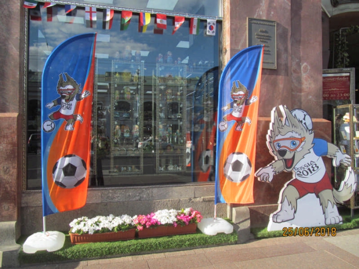 Чемпионат мира по футболу 2018. Приветственное оформление Санкт-Петербурга. Флаги и фигура волка Забиваки на Невском проспекте : [фотография] / фото Е. В. Коротковой. - Электронные графические данные (1 файл, JPEG, 0,3 Мб). -Санкт-Петербург, 25 июня 2018 года. - Режим доступа: интернет-портал Президентской библиотеки. Информация о фотографии предоставлена автором. Место и дата съемки: г. Санкт-Петербург, Невский проспект, 25 июня 2018 года. На снимке: флаги и фигура волка Забиваки - талисмана Чемпионата мира по футболу 2018, установленные на Невском проспекте. Копирование пользователями не разрешается.