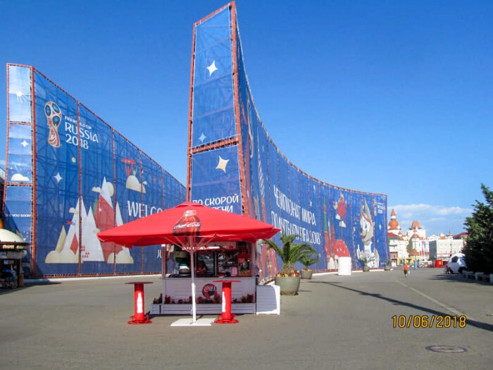 Чемпионат мира по футболу 2018. Приветственное оформление г. Сочи. Олимпийский парк. [5] : [фотография] / фото Е. В. Коротковой. - Электронные графические данные (1 файл, JPEG, 0,6 Мб). -Сочи, 10 июня 2018 года. - Режим доступа: интернет-портал Президентской библиотеки. Информация о фотографии предоставлена автором. Место и дата съемки: г. Сочи, Олимпийский парк, 10 июня 2018 года. На снимке: два билборда с символикой Чемпионата мира по футболу 2018, установленные в Олимпийском парке г. Сочи. Копирование пользователями не разрешается. Олимпийский парк расположен на территории Адлерского района города Сочи, в Имеретинской низменности, на берегу Черного моря. Сооружен в 2013 году в рамках подготовки к проведению XXII зимних Олимпийских игр. Архитектурный ансамбль Олимпийского парка представляет собой шесть сооружений спортивных арен, расположенных вокруг площади, в центре которой возвышается «Чаша Олимпийского огня». На территории парка находятся главные спортивные объекты, на которых проводились соревнования зимней Олимпиады. Главным сооружением Олимпийского парка является стадион «Фишт», на котором прошли церемонии открытия и закрытия XXII зимних Олимпийских игр. В Олимпийском парке также расположены: ледовый дворец «Большой», ледовый дворец спорта «Айсберг», малая ледовая арена «Шайба», крытый конькобежный центр «Адлер-Арена», арена для керлинга «Ледяной куб», две тренировочных арены, площадь для награждения победителей «Медаль-Плаза», олимпийская деревня, главный медиа-центр и другие сооружения