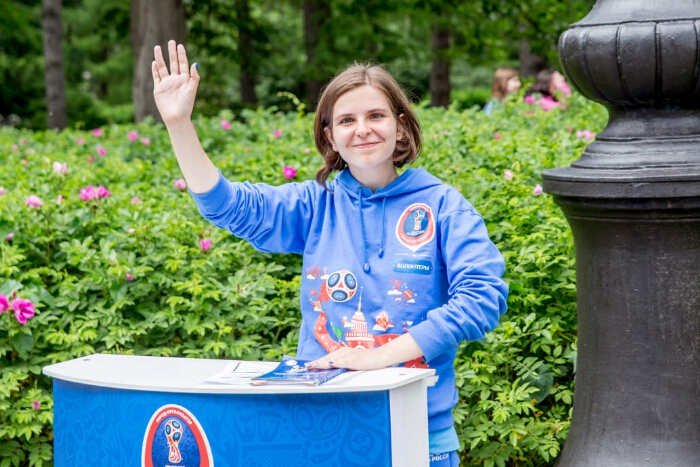 Чемпионат мира по футболу 2018. Волонтер за стойкой информации (Санкт-Петербург) : [фотография] / фото А. А. Кассировой. - Электронные графические данные (1 файл, JPEG: 2,3 Мб). -Санкт-Петербург, 22 июня 2018 года. - Режим доступа: интернет-портал Президентской библиотеки. Информация о фотографии предоставлена автором. Место и дата съемки: Санкт-Петербург, Крестовский остров, 22 июня 2018 года. На снимке: волонтер стоит за стойкой информации, установленной на Батарейной дороге, ведущей на стадион "Санкт-Петербург" в день матча Бразилия - Коста-Рика. Копирование пользователями не разрешается.