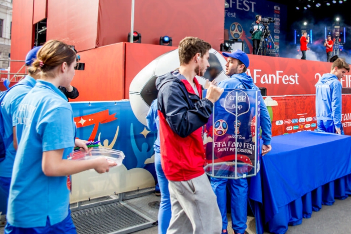 Чемпионат мира по футболу 2018. Фестиваль болельщиков FIFA (Санкт-Петербург, Конюшенная пл.). Матч Россия - Уругвай (25.06.2018). Интерактивная игра "Спор бар". [4] : [фотография] / фото А. А. Кассировой. - Электронные графические данные (1 файл, JPEG: 2,1 Мб). -Санкт-Петербург, 25 июня 2018 года. -