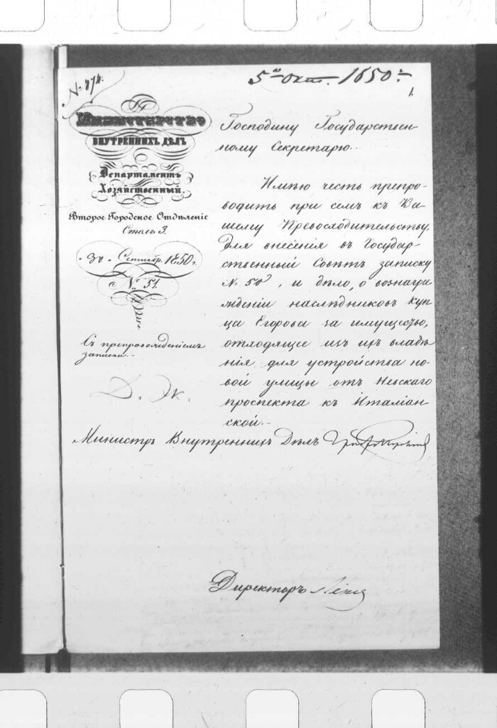 | Дело | РГИА. Ф. 1152 Оп. 4 Д. 121 Дело о вознаграждении наследников купца Егорова за имущество, отчуждаемое из владения их для устройства новой улицы с Невского проспекта к Итальянской. начато 30 сентября 1850 года : Высочайше утверждено 24 января 1851 года : 1850-1851 |