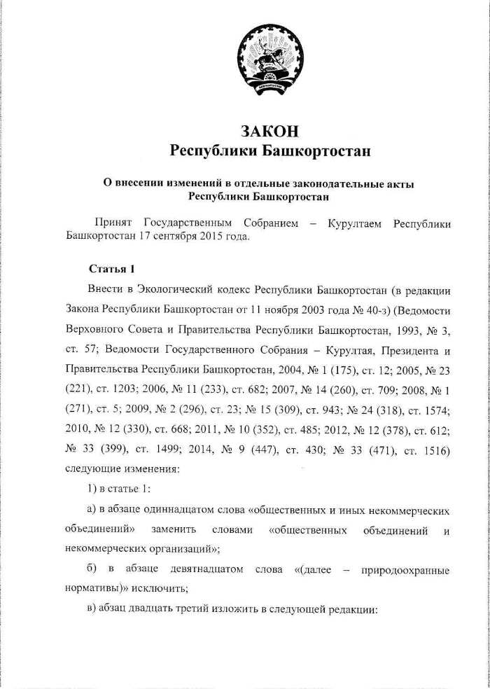 О внесении изменений в отдельные законодательные акты Республики Башкортостан : Закон Республики Башкортостан от 18.09.2015 № 264-з. - Электронные текстовые данные (31 файла). -(Москва: ГлавНИВЦ УДП РФ , 2018). - Режим доступа: интернет-портал Президентской библиотеки. Загл. с титульной страницы. Электронная версия:Закон Республики Башкортостан от 18.09.2015 № 264-з "О внесении изменений в отдельные законодательные акты Республики Башкортостан".