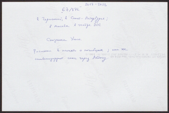 Елена Гремина. 67/871 : документальный спектакль о блокаде / Театр Поколений. [Сцена из спектакля]. Актриса Сюзанна Хосс. Рисунки в память о погибших, они же символизируют снег через Ладогу : [фотография]. - Санкт-Петербург, [между 2017 и 2018]. - Цифровая печать, черно-белая. - Режим доступа: интернет-портал Президентской библиотеки. Заглавие из сопроводительного документа. Электронная репродукция (2 файла, JPEG : 5,1 МБ). Копирование пользователями не разрешается. 67/871 - совместный проект Театра Поколений (Санкт-Петербург) и Drama Panorama (Берлин). 67 документальных свидетельств о 871 дне блокады Ленинграда - результат длительной работы международного коллектива. Актеры Театра Поколений и их немецкие коллеги в течение года собирали документальный материал о блокаде, брали интервью у очевидцев, искали документы в русских и немецких архивах. По этим материалам была написана пьеса (автор: Елена Гремина) и поставлен спектакль (режиссер: Эберхард Келер, Германия). Мировая премьера спектакля состоялась 8 сентября 2017 года в Theater Unterm Dach (Берлин), российская - 27 января 2018 года в Театре Поколений. 30 июня и 1 июля 2018 года состоялась премьера полной версии спектакля