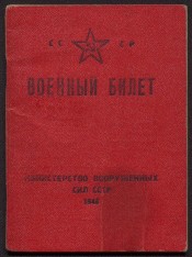 Большаков, Николай Михайлович. Военный билет. Серия А № 11228. - [Москва] : Министерство вооруженных сил СССР, 1948. -16, [1] с., в обл., бумага. - Режим доступа: интернет-портал Президентской библиотеки. На обложке: СССР. Военный билет. Электронная версия (20 файлов, JPEG : 15,3 МБ). Копирование пользователями не разрешается. Военный билет рядового Советской Армии, серия А № 11228, выдан Большакову Николаю Михайловичу, 1911 года рождения, Василеоостровским военкоматом г. Ленинграда 21 июня 1948 г. На 2-й с. обложки - фамилия, имя и отчество, личная подпись владельца билета, личный номер, выдавший орган, дата выдачи, подпись (должность, звание и фамилия) выдавшего. Имеется фотография Н. М. Большакова в форме (4х3 см). Документ заполнен фиолетовыми чернилами, заверен печатями, имеются штампы (печати размыты, часть текста не читается). Заполнены: 2-я с. обложки, с. 1-6, 10-11, 15, 3-я с. обложки. - Большаков Николай Михайлович (род. 1911 г.) - ветеран Великой Отечественной войны. Родился и жил в Ленинграде. 22 июня 1941 г. был призван по мобилизации Приморским райвоенкоматом г. Ленинграда. Встретил победу в г. Кенигсберге. Награжден орденом Красной Звезды и медалью "За победу над Германией"
