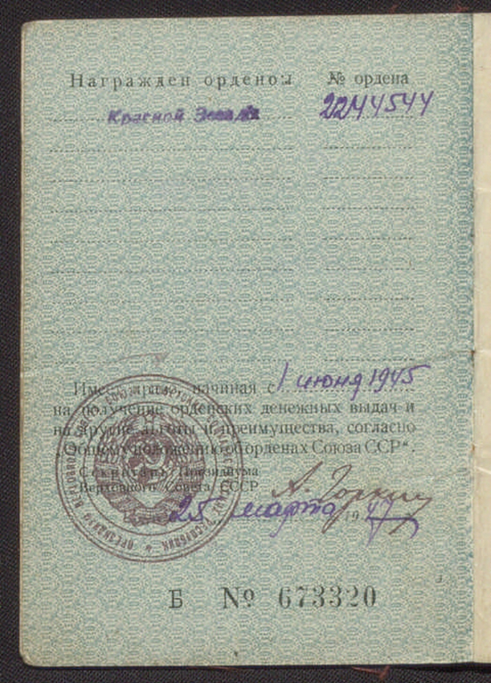 Большаков, Николай Михайлович. Орденская книжка Б № 673320. - Москва : Гознак, 1946. -12 с., в обл., бумага. - Режим доступа: интернет-портал Президентской библиотеки. На обложке: Союз Советских Социалистических Республик. Орденская книжка. Электронная версия (12 файлов, JPEG : 8,3 МБ). Копирование пользователями не разрешается. Орденская книжка Б № 673320 выдана Большакову Николаю Михайловичу 25 марта 1947 г. На 2-й с. обложки отсутствует фотография, имеется штамп "Действительно без фотокарточки". На 1-й с. книжки: фамилия, имя, отчество владельца. На 2-й с. книжки перечислены ордена: Красной Звезды (№ 21244544), внизу - собственноручная подпись: Секретарь Президиума Верховного Совета СССР А. Горкин. Документ заполнен фиолетовыми чернилами, заверен гербовой печатью Президиума Верховного Совета Союза Советских Социалистических Республик. В книжке также: Извлечения из "Общего положения об орденах Союза ССР" (утверждено постановлением ЦИК и СНК Союза ССР от 7 мая 1936 г.) ; Правила о порядке получения награжденными орденами Союза ССР льгот и преимуществ, предоставленных им общим положением об орденах Союза ССР. - Большаков Николай Михайлович (1911-1973) - ветеран Великой Отечественной войны. Родился и жил в Ленинграде. 22 июня 1941 г. был призван на фронт по мобилизации Приморским райвоенкоматом г. Ленинграда. Встретил победу в г. Кенигсберге. Награжден орденом Красной Звезды и медалью "За победу над Германией"