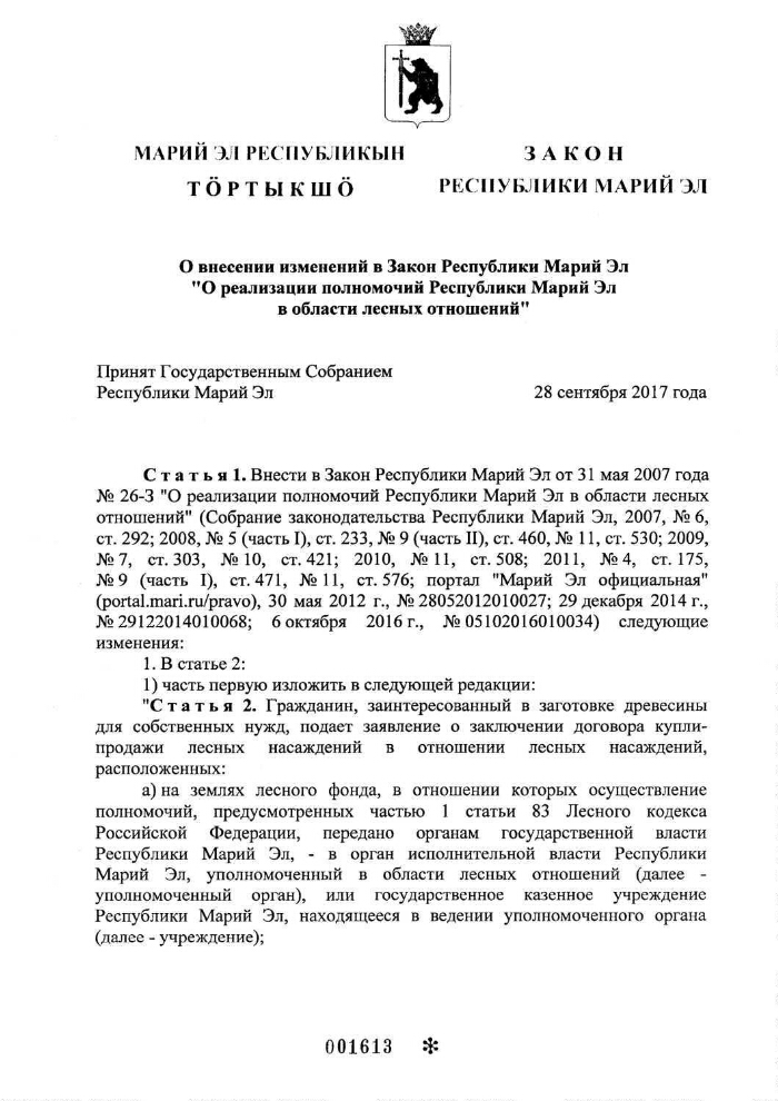 О внесении изменений в Закон Республики Марий Эл "О реализации полномочий Республики Марий Эл в области лесных отношений" : Закон Республики Марий Эл от 03.10.2017 № 46-З. - Электронные текстовые данные (5 файла). -(Москва: ГлавНИВЦ УДП РФ , 2018). - Режим доступа: интернет-портал Президентской библиотеки. Загл. с титульной страницы. Электронная версия:Закон Республики Марий Эл от 03.10.2017 № 46-З "О внесении изменений в Закон Республики Марий Эл "О реализации полномочий Республики Марий Эл в области лесных отношений".