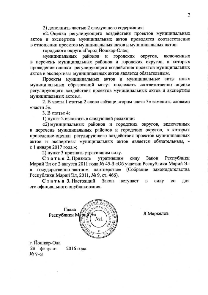 О внесении изменений в Закон Республики Марий Эл "О порядках проведения оценки регулирующего воздействия проектов муниципальных нормативных правовых актов и экспертизы муниципальных нормативных правовых актов, затрагивающих вопросы осуществления предпринимательской и инвестиционной деятельности" и признании утратившим силу Закона Республики Марий Эл "Об участии Республики Марий Эл в государственно-частном партнерстве" : Закон Республики Марий Эл от 29.02.2016 № 7-З. - Электронные текстовые данные (2 файла). -(Москва: ГлавНИВЦ УДП РФ , 2018). - Режим доступа: интернет-портал Президентской библиотеки. Загл. с титульной страницы. Электронная версия:Закон Республики Марий Эл от 29.02.2016 № 7-З "О внесении изменений в Закон Республики Марий Эл "О порядках проведения оценки регулирующего воздействия проектов муниципальных нормативных правовых актов и экспертизы муниципальных нормативных правовых актов, затрагивающих вопросы осуществления предпринимательской и инвестиционной деятельности" и признании утратившим силу Закона Республики Марий Эл "Об участии Республики Марий Эл в государственно-частном партнерстве".