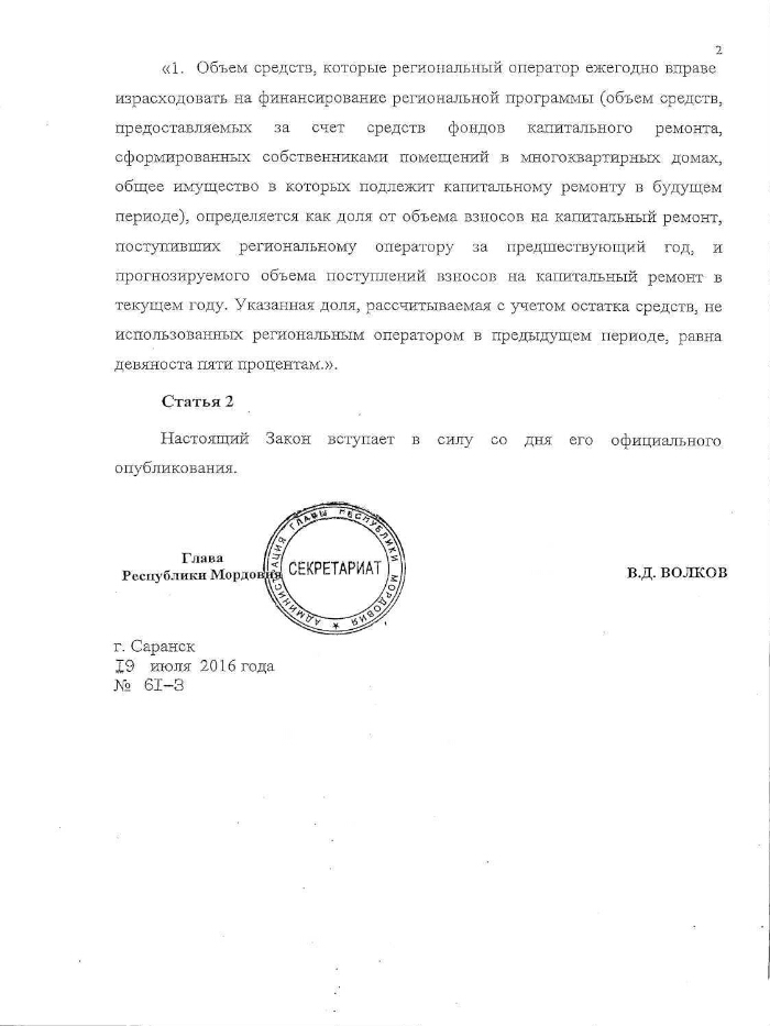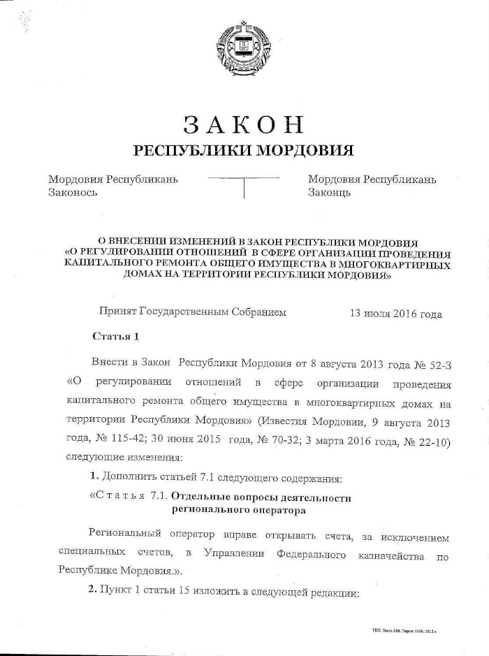 О внесении изменений в Закон Республики Мордовия "О регулировании отношений в сфере организации проведения капитального ремонта общего имущества в многоквартирных домах на территории Республики Мордовия" : Закон Республики Мордовия от 19.07.2016 № 61-З. - Электронные текстовые данные (2 файла). -(Москва: ГлавНИВЦ УДП РФ , 2018). - Режим доступа: интернет-портал Президентской библиотеки. Загл. с титульной страницы. Электронная версия:Закон Республики Мордовия от 19.07.2016 № 61-З "О внесении изменений в Закон Республики Мордовия "О регулировании отношений в сфере организации проведения капитального ремонта общего имущества в многоквартирных домах на территории Республики Мордовия".