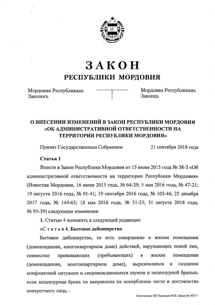 О внесении изменений в Закон Республики Мордовия "Об административной ответственности на территории Республики Мордовия" : Закон Республики Мордовия от 25.09.2018 № 78-З. - Электронные текстовые данные (2 файла). -(Москва: ГлавНИВЦ УДП РФ , 2018). - Режим доступа: интернет-портал Президентской библиотеки. Загл. с титульной страницы. Электронная версия:Закон Республики Мордовия от 25.09.2018 № 78-З "О внесении изменений в Закон Республики Мордовия "Об административной ответственности на территории Республики Мордовия".
