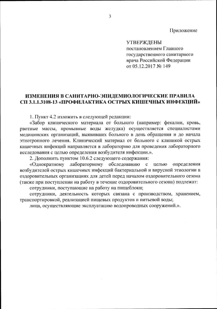 О внесении изменений в санитарно-эпидемиологические правила СП 3.1.1.3108-08 "Профилактика острых кишечных инфекций", утвержденные постановлением Главного государственного санитарного врача Российской Федерации от 09.10.2013 № 53" : Постановление Главного государственного санитарного врача Российской Федерации от 05.12.2017 № 149. - Электронные текстовые данные (3 файла). -(Москва: ГлавНИВЦ УДП РФ , 2018). - Режим доступа: интернет-портал Президентской библиотеки. Загл. с титульной страницы. Электронная версия: Постановление Главного государственного санитарного врача Российской Федерации от 05.12.2017 № 149 "О внесении изменений в санитарно-эпидемиологические правила СП 3.1.1.3108-08 "Профилактика острых кишечных инфекций", утвержденные постановлением Главного государственного санитарного врача Российской Федерации от 09.10.2013 № 53".
