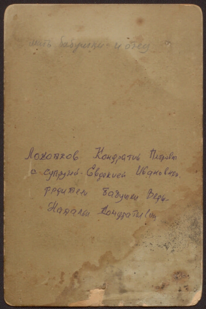 Локотков Кондратий Петрович с супругой Евдокией Ивановной : [фотография]. - [1890]. - Фотопечать, черно-белая. - Режим доступа: интернет-портал Президентской библиотеки. Заглавие из сопроводительного документа. Фотография выполнена в формате "Кабинет-портрет", наклеена на картон. На оборотной стороне сверху написано от руки карандашом: мать бабушки и отец. Ниже, фиолетовыми чернилами: Локотков Кондратий Петрович с супругой Евдокией Ивановной, родители бабушки Веры - Натальи Кондратьевны. Фотография ветхая, с пятнами. В электронном фонде Президентской библиотеки представлены материалы супруги Гордеева Бориса Федоровича Гордеевой (урожденной Семеновой) Веры Борисовны. Электронная репродукция (2 файла, JPEG : 1,3 МБ). Фотопортрет, сидя. На фоне избы. Копирование пользователями не разрешается. Локотков Кондратий Петрович - прадедушка Гордеевой (урожденной Семеновой) Веры Борисовны. - Иванова (урожденная Локоткова) Наталья Кондратьевна - прабабушка Гордеевой (урожденной Семеновой) Веры Борисовны