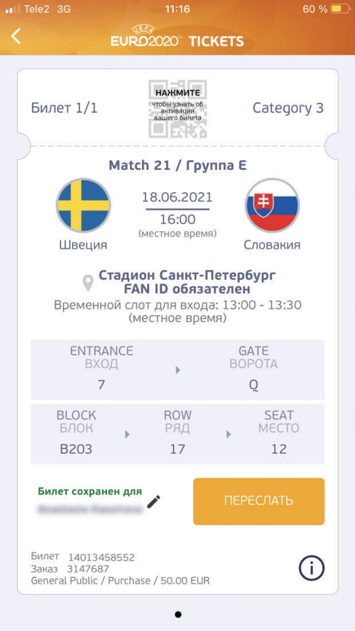 UEFA EURO 2020. Match 21 / Группа E. Швеция - Словакия. Стадион Санкт-Петербург. 18.06.2021 : [мобильный билет] / UEFA EURO 2020 Tickets. - [2021]. -1 файл. - Режим доступа: интернет-портал Президентской библиотеки. Билет: Вход 7. Ворота Q. Блок B203. Ряд 17. Место 12. Category 3. Цифровая копия мобильного билета. Копирование пользователями не разрешается. Мобильный билет на матч группы E "Швеция - Словакия", состоявшегося 18 июня 2021 года в Санкт-Петербурге на стадионе "Санкт-Петербург" в рамках группового этапа Чемпионата Европы по футболу UEFA EURO 2020. Начало в 16:00 (местное время). Билет имеет вертикальное орнаментально-художественное оформление. На лицевой стороне – названия команд, сведения о дате, месте и времени проведения матча, информация о билете