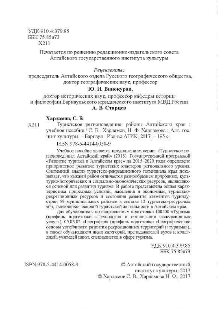 Туристское регионоведение: районы Алтайского края : учебное пособие / С. В. Харламов, Н. Ф. Харламова ; Федеральное государственное бюджетное образовательное учреждение высшего образования "Алтайский государственный институт культуры", Федеральное государственное бюджетное образовательное учреждение высшего образования "Алтайский государственный университет". - Барнаул : издательство Алтайского государственного института культуры, 2017. -195 с. : ил., табл., цв. ил. ; 20 см. - Библиография: с. 189-195 (81 название). . -50 экз. -ISBN 978-5-4414-0058-9
