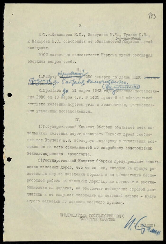 Заголовок | Постановление ГКО СССР № 1486 об освобождении Кагановича Л. М. от обязанностей наркома путей сообщения и о назначении на эту должность Хрулева А. В. |