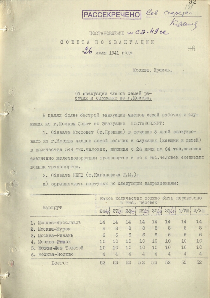 Постановление Совета по эвакуации при СНК СССР № СЭ-49сс "Об эвакуации членов семей рабочих и служащих из г. Москвы" |