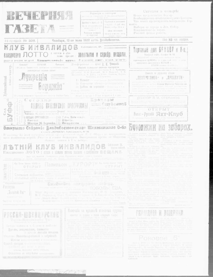 Вечерняя газета. - 1921, № 1 (24 июня) -. -Владивосток, 1921-1922. - Издатель и редактор В. Н. Иванов. Ежедневно. - Издавалась с июня 1921 г. по октябрь 1922 г.