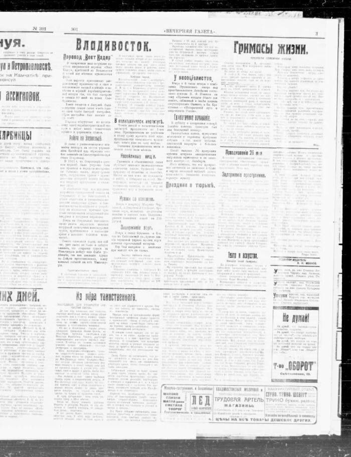 Вечерняя газета. - 1921, № 1 (24 июня) -. -Владивосток, 1921-1922. - Издатель и редактор В. Н. Иванов. Ежедневно. - Издавалась с июня 1921 г. по октябрь 1922 г.