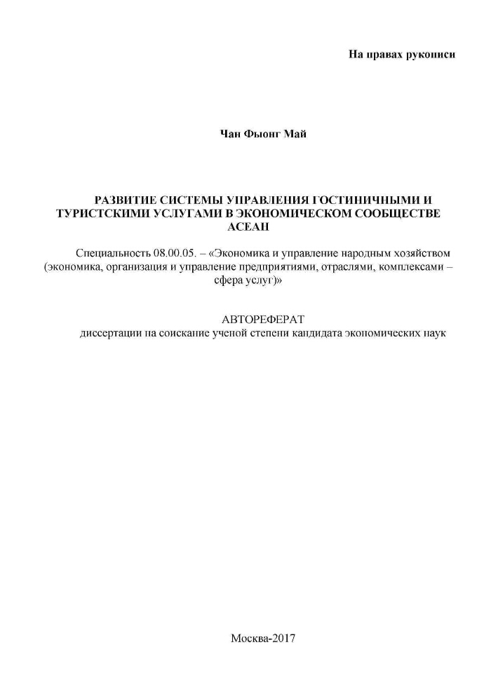 Развитие системы управления гостиничными и туристскими услугами в экономическом сообществе АСЕАН : автореферат дис. на соиск. уч. степ. кандидата экономических наук : специальность / Чан Фыонг Май ; [Место защиты: Гос. ун-т упр.]. - Москва, 2017. -28 с. : ил. ; 21. - Библиогр.: с.28 (8 назв.).