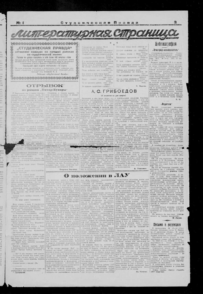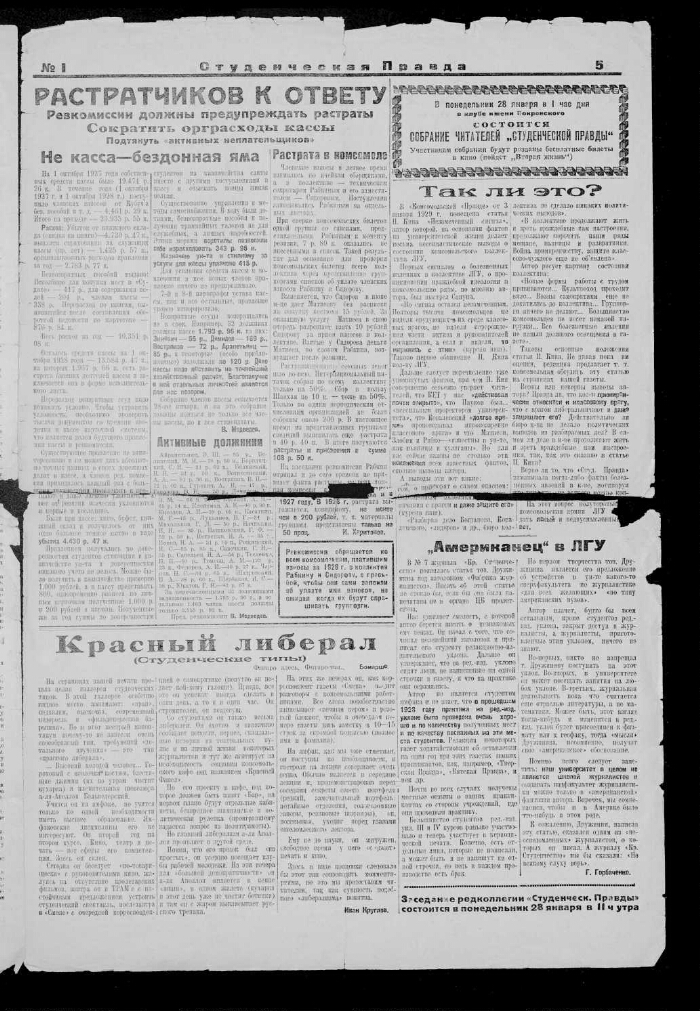 Студенческая правда : орган студентов и работников Ленинградского государственного университета. - Г. 1 1927, № 1 (7 ноября) - Г. 2 1929, № 24. -Ленинград, 1927-1929. - Заглавия: 1927 - 1929 "Студенческая правда" ; 1930 - 1991 Ленинградский университет ; 1991 - 1995 Санкт-Петербургский университет. Подзаголовок: 1927, № 1 - 1929, № 7 газета студентов и работников Ленинградского государственного университета ; 1929, № 8 - 1929, № 24 двухнедельная газета студентов и работников Ленинградского государственного университета. Выходит с 7 ноября 1927 г. С 1925 года в Ленинградском государственном университете издавалась еженедельная стенная газета "Студенческая правда". Ее вывешивали в главном коридоре здания Двенадцати коллегий. В газете писали о событиях университетской жизни, работе парткома, комсомольской и профсоюзной организации, о диспутах и лекциях, публиковали стихи. "Студенческая правда" пользовалась большой популярностью и просуществовала в таком виде полтора года. Затем стало понятно, что для такого большого университета необходима уже не стенная, а обычная газета. 7 ноября 1927 года вышел первый выпуск настоящей газеты "Студенческая правда". Издавалась два раза в месяц. В 1930 году она была переименована в "Ленинградский университет", в 1991 – "Санкт-Петербургский университет"