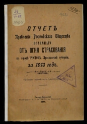 За 1913 год: Отчет Правления Ростовского общества взаимного от огня страхования в г. Ростове, Ярославской губернии : (37-й год существования). - Тип. А.Х. Оппель, 1914. -25 с. : табл.. -