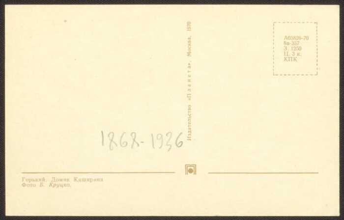 Горький. Домик Каширина : [открытка] / фото Б. Круцко. - Электронные данные (2 файла : 1,5 МБ). -(Санкт-Петербург: Президентская библиотека , 2023). - Режим доступа: интернет-портал Президентской библиотеки. Заглавие с экрана. Открытка является частью комплекта: Горький [Изоматериал] / фото Б. Круцко. Москва : Планета, 1970. 15 листов в обложке : цветной офсет. Города СССР. А 05826-70. 50 коп. Местонахождение: Детский музей открытки, Санкт-Петербург. Электронная репродукция открытки: Горький. Домик Каширина / фото Б. Круцко. Москва : Планета, 1970. Цветной офсет. А 05826-70 г. 3 коп. Местонахождение: Детский музей открытки, Санкт-Петербург. Копирование пользователями не разрешается.