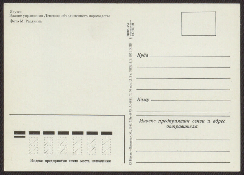 Якутск. Здание управления Ленского объединенного пароходства : [открытка] / фото М. Редькина. - Электрон. дан. -(Санкт-Петербург: Президентская библиотека , 2025). -2 файла (2,2 Мб, JPEG) : цв.. - Режим доступа: интернет-портал Президентской библиотеки. Заглавие с экрана. Электронная репродукция почтовой карточки: Якутск. Здание управления Ленского объединенного пароходства / фото М. Редькина. Москва : издательство "Планета", 1981. 1 лист : цветной офсет. А04841. З. 1971. Цена 2 коп. Тираж 50 тыс. экз. Местонахождение: Из частного собрания. Копирование пользователями не разрешается.