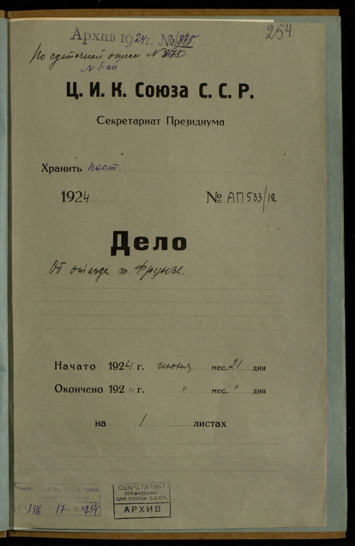 | Заголовок | Об отъезде т. Фрунзе М. В. |