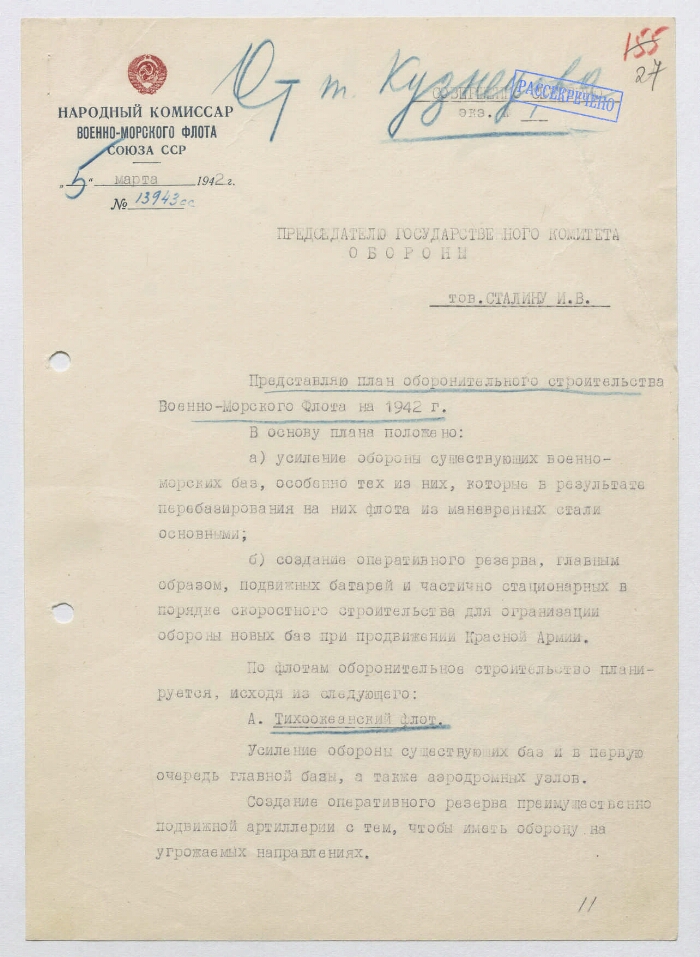 | Заголовок | Докладная записка наркома ВМФ СССР Н. Г. Кузнецова И. В. Сталину о плане оборонительного строительства ВМФ на 1942 г. |