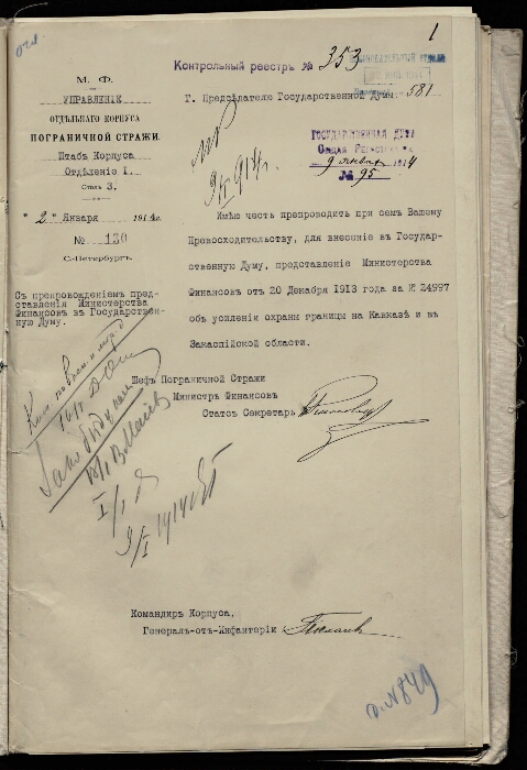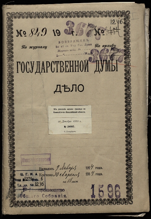 | Заголовок | Дело по законопроекту Министерства финансов, внесенному в Государственную думу Четвертого созыва, об усилении охраны границы на Кавказе и в Закаспийской области, в связи с возросшим товарообменом между Россией, Турцией и Персией |