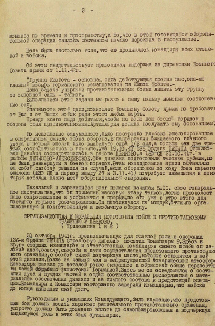 | Заголовок | Доклад начальника штаба 9-й армии Южного фронта А. Е. Брейдо об оборонительных боях армии с 5 октября по 8 ноября 1941 г. в битве за Ростов, с приложением копий боевого приказа и распоряжения штаба 136-й стрелковой дивизии за 1 и 3 ноября 1941 г., схемы замысла операции 1-й танковой армии Э. фон Клейста по окружению и разгрому 9-й и 56-й армий, схемы расположения частей 9-й армии и направления атак противника 5 ноября 1941 г. и др. |