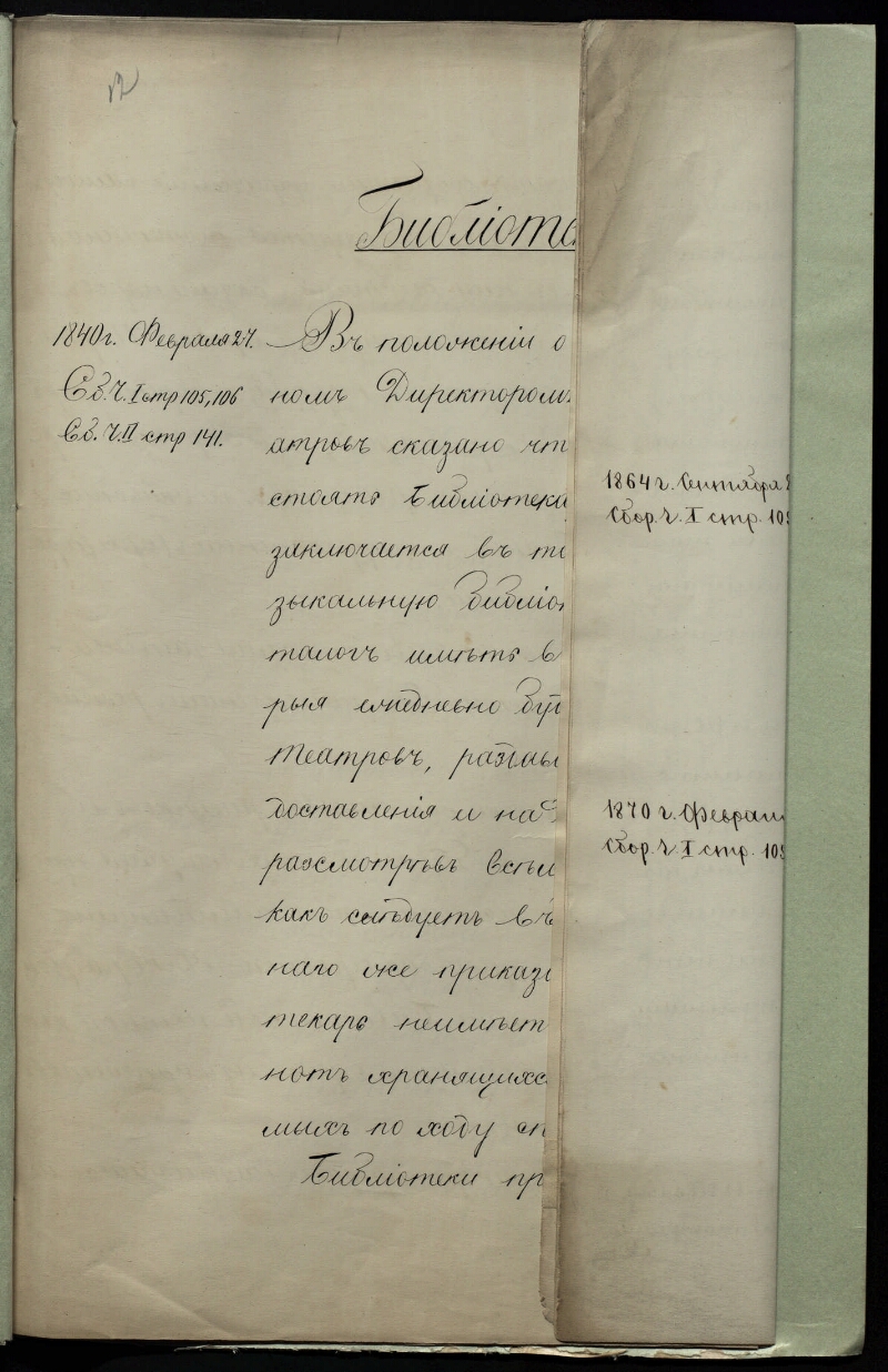 | Примечания | Заголовок дела также: Выписки из Полного собрания законов, "высочайших" повелений и сборника постановлений по театральной части Оригинальный заголовок дела: Выписки из ПСЗ "высочайших" повелений о библиотеке и нотной конторе Рукописный текст |