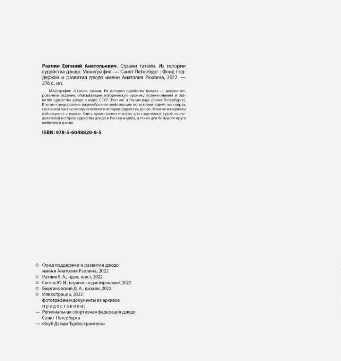 Стражи татами. Из истории судейства дзюдо / Е. А. Рахлин. - Санкт-Петербург : Фонд поддержки и развития дзюдо имени Анатолия Рахлина, 2022. -273, [2] с. : ил., цв. ил., портр.. -350 экз. -ISBN 978-5-6048820-8-5