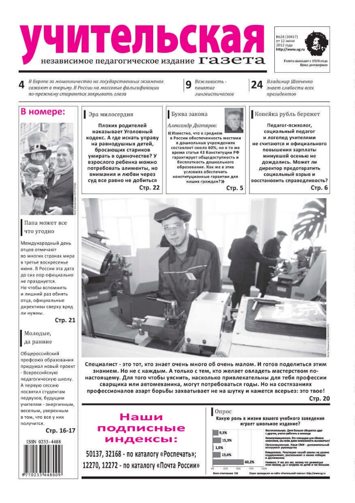 Учительская газета : орган Министерства просвещения СССР и Центрального комитета Профсоюза работников просвещения, высшей школы и научных учреждений. - 1924, № 1 (3 октября) -. -Москва, 1924-. - Заглавие: 1930, № 42 - 1936 "За коммунистическое просвещение", с октября 1937 вновь выходит под названием "Учительская газета". Подзаголовок: 1920-е гг. орган Центрального комитета Союза работников просвещения СССР ; 1930-е - 1940-е гг. орган министерств просвещения союзных республик и центральных комитетов профсоюзов работников начальной и средней школы, высшей школы и научно-исследовательских учреждений, политико-просветительных учреждений и дошкольных работников ; 1950-е гг. орган министерств просвещения союзных республик и центральных комитетов профсоюзов работников начальной и средней школы, высшей школы и научных учреждений, политико-просветительных учреждений ; орган министерств просвещения союзных республик и центральных комитетов профсоюзов работников просвещения ; 1960-е гг. орган Министерства просвещения РСФСР и Центрального комитета Профсоюза работников просвещения, высшей школы и научных учреждений СССР ; 1970-е - 1980-е гг. орган Министерства просвещения СССР и Центрального комитета Профсоюза работников просвещения, высшей школы и научных учреждений ; 2000-е гг. независимое педагогические издание. С 2010 г. с тематическими приложениями-вкладками к отдельным выпускам. В 1924-1991 гг. выходила 3 раза в неделю, с 1992 г. - 1 раз в неделю. - Выходит с 3 октября 1924 г. Основана в 1924 г. при участии Н. К. Крупской. Первый номер вышел 3 октября 1924 г. Издавалась в Москве как орган Министерства просвещения СССР и Центрального комитета Профсоюза работников просвещения, высшей школы и научных учреждений. С 1930 (№ 42) по 1936 гг. называлась "За коммунистическое просвещение", с октября 1937 г. вновь выходит под прежним названием. Периодичность: 3 раза в неделю. Кроме центральной газеты в союзных республиках также издавались газеты на национальных языках. В 1991 г. газета стала независимым изданием. Учредитель: Журналистский коллектив редакции. Издатель: АО "Издательский дом "Учительская газета". Периодичность: 1 раз в неделю (с 1992 г.). На страницах "Учительской газеты" освещаются различные проблемы воспитания и обучения, педагогического образования, жизни и труда учителей, размещаются материалы о передовом опыте учителей. -ISSN 0233-4488