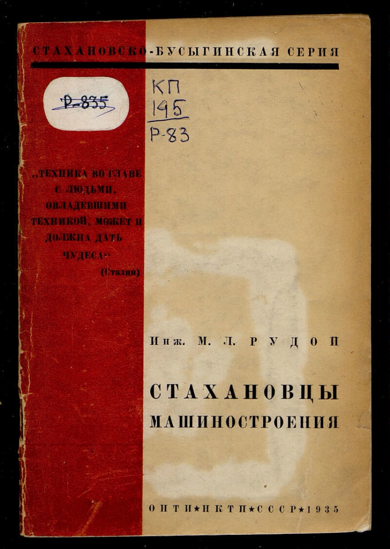 Стахановцы машиностроения / Инж. М.Л. Рудой ; Главная редакция литературы по машиностроению и металлообработке. - [Москва] : ОНТИ, Сектор ведомственной литературы, 1935. -54, [2] с. : портр., табл., ил., черт., диагр. ; 19 х 13,5 см. - (Стахановско-бусыгинская серия). - На обл. изд-во: ОНТИ НКТП СССР.