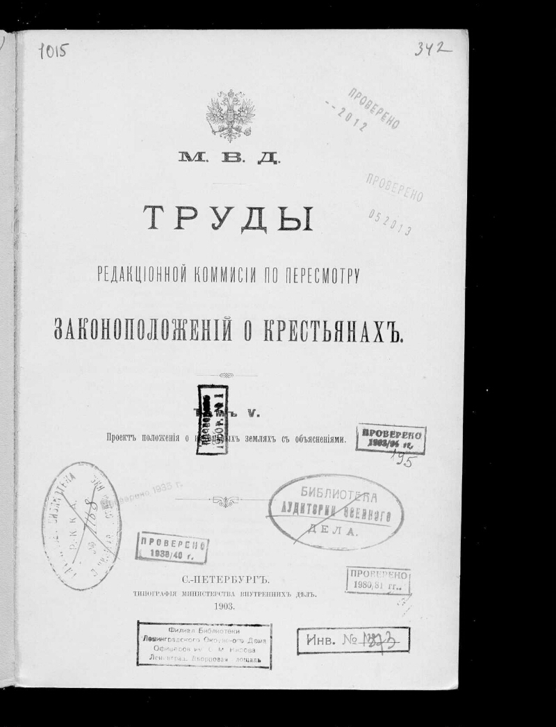 Т. 5: Проект положения о надельных землях с объяснениями. - Тип. Министерства внутренних дел, 1903 (обл. 1904). -III, 557, [4] с. : табл. ; 26,5 х 18 см. - Библиогр. в тексте и подстроч. примеч.