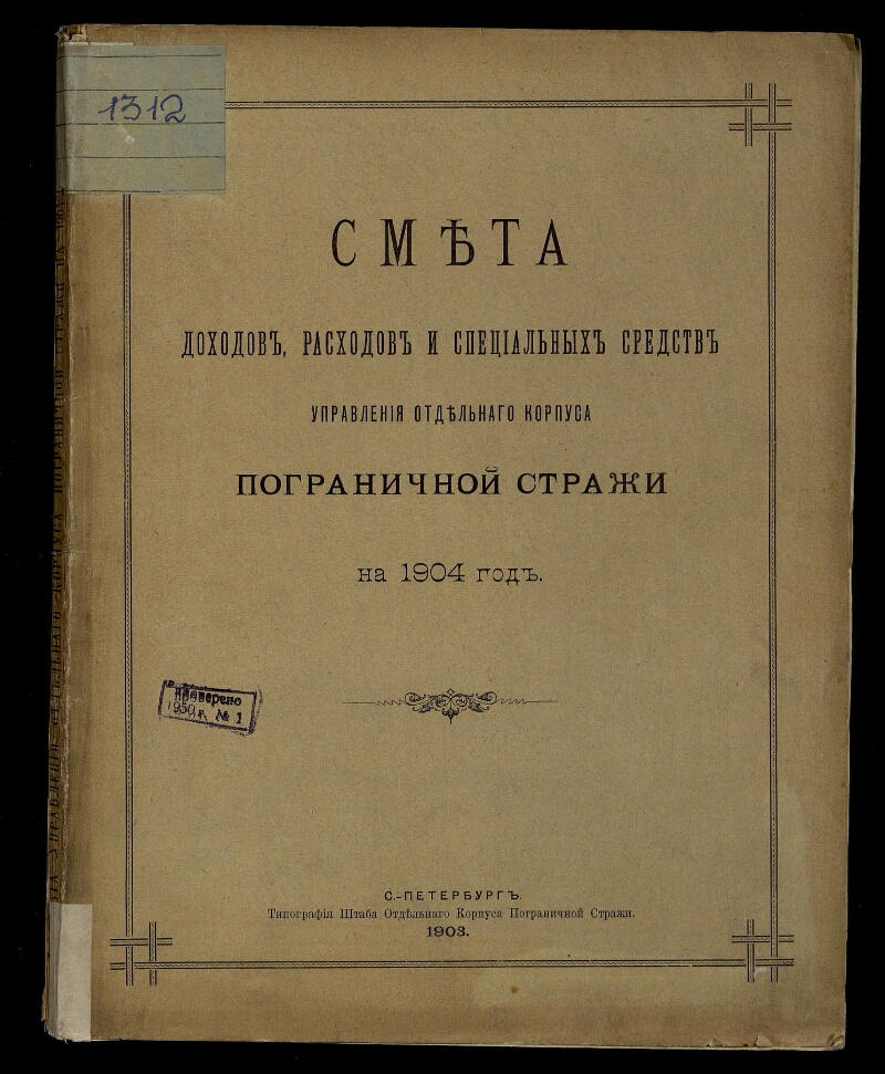 Смета доходов, расходов и специальных средств Управления Отдельного корпуса пограничной стражи... - Санкт-Петербург : [Б. и.], 1894-1918. - 29 х 22,8 см. -