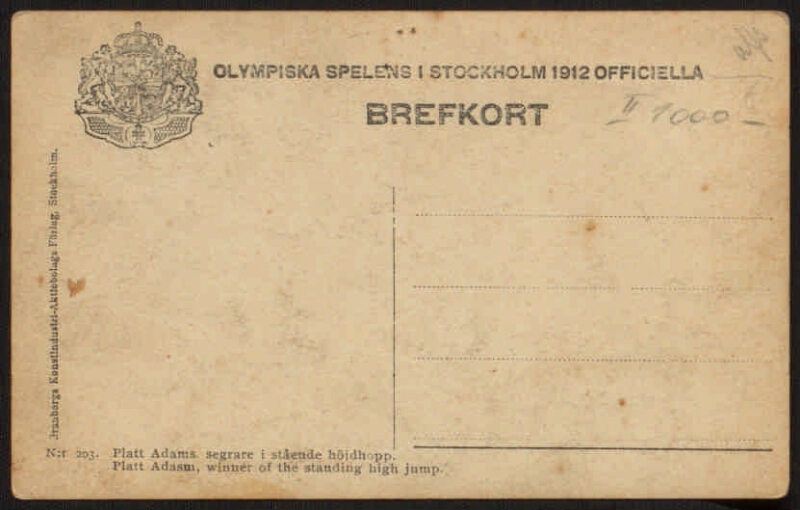Platt Adams. Segrare i stäende höjdhopp [Изоматериал : электронный ресурс] = Platt Adams, winner of standing high jump : [открытка]. - Электронные данные (2 файла : 2,35 МБ). - (Санкт-Петербург: Президентская библиотека имени Б.Н. Ельцина , 2013). - Режим доступа: интернет-портал Президентской библиотеки имени Б.Н. Ельцина. Заглавие с экрана. На оборотной стороне надпись вверху: "Olympiska spelens i Stockholm 1912 officiella brefkort"; внизу перед заглавием номер "N:r 203". Электронная репродукция открытки: Platt Adams. Segrare i stäende höjdhopp [Изоматериал] = Platt Adams, winner of standing high jump. Stockholm : Granbergs Konstindustri-Akttebolags, [1912]. 1 открытка : фотопечать. Местонахождение: Детский музей открытки, Санкт-Петербург. Копирование пользователями не разрешается