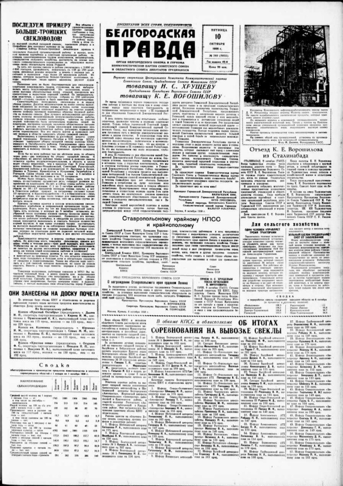 Белгородская правда : областная общественно-политическая газета : орган Белгор. обкома и горкома КПСС и обл. Совета депутатов трудящихся. - 1917, 24 июня -. - Белгород, 1917-. - Выходит 4 раза в неделю. В 1967-1968 гг. на страницах газеты печатались Сменные страницы. Ред.: 1968- Н. Вашкевич. Выходит с 24 июня 1917 г.