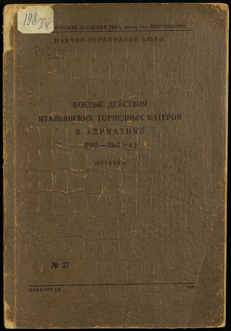 Боевые действия итальянских торпедных катеров в Адриатике (1915-1918 гг.) : (перевод) / Военно-морская академия РККА имени тов. Ворошилова, Научно-переводное бюро ; [перевели: В. Чернышев и Ю. Ралль]. - Ленинград : Типо-литография Военно-морской академии РККА имени тов. Ворошилова, 1936. - 51 с. - На титульном листе и обложке: № 27. Переводчики указаны на обороте титульного листа. В книге также: Борьба малыми средствами: перевод с немецкого. - Машинописный текст. Литография. - Для служебного использования. - 600 экз.