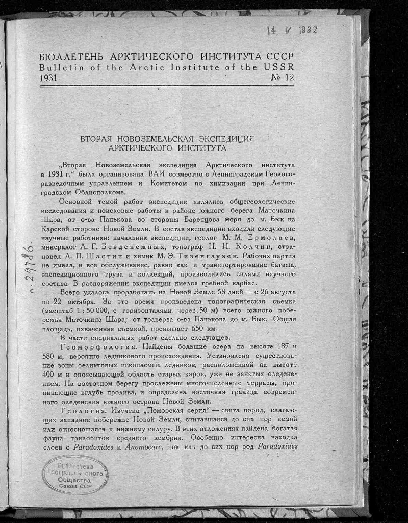 Бюллетень Арктического института СССР = Bulletin of the Arctic institute of the USSR. - Г. 1-6. - Ленинград, 1931-1936. - Издательство: 1931 - 1934, № 6/7 - издательство Всесоюзного арктического института ; 1934, № 8/9 - 1936, № 7 - Главсевморпуть. Издание прекращено с 1937 г. Взамен выходит журнал "Проблемы Арктики" .
