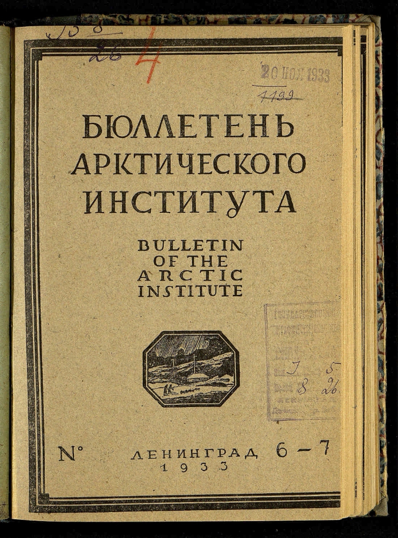 Бюллетень Арктического института СССР = Bulletin of the Arctic institute of the USSR. - Г. 1-6. - Ленинград, 1931-1936. - Издательство: 1931 - 1934, № 6/7 - издательство Всесоюзного арктического института ; 1934, № 8/9 - 1936, № 7 - Главсевморпуть. Издание прекращено с 1937 г. Взамен выходит журнал "Проблемы Арктики" .