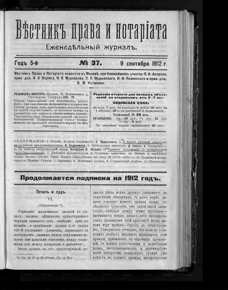 Г. 5 1912, № 37. - [1912]. - С. 1129-1160. - Содерж.: 1. Печать и суд (окончание) / [соч.] С. Ордынского. 2. О праве русской женщины на судебное представительство/ [соч.] В. Евдокимова. 3. Обойденные законом / Д. Ионас. 4. Нотариат. 5. Действия правительства [и др.]