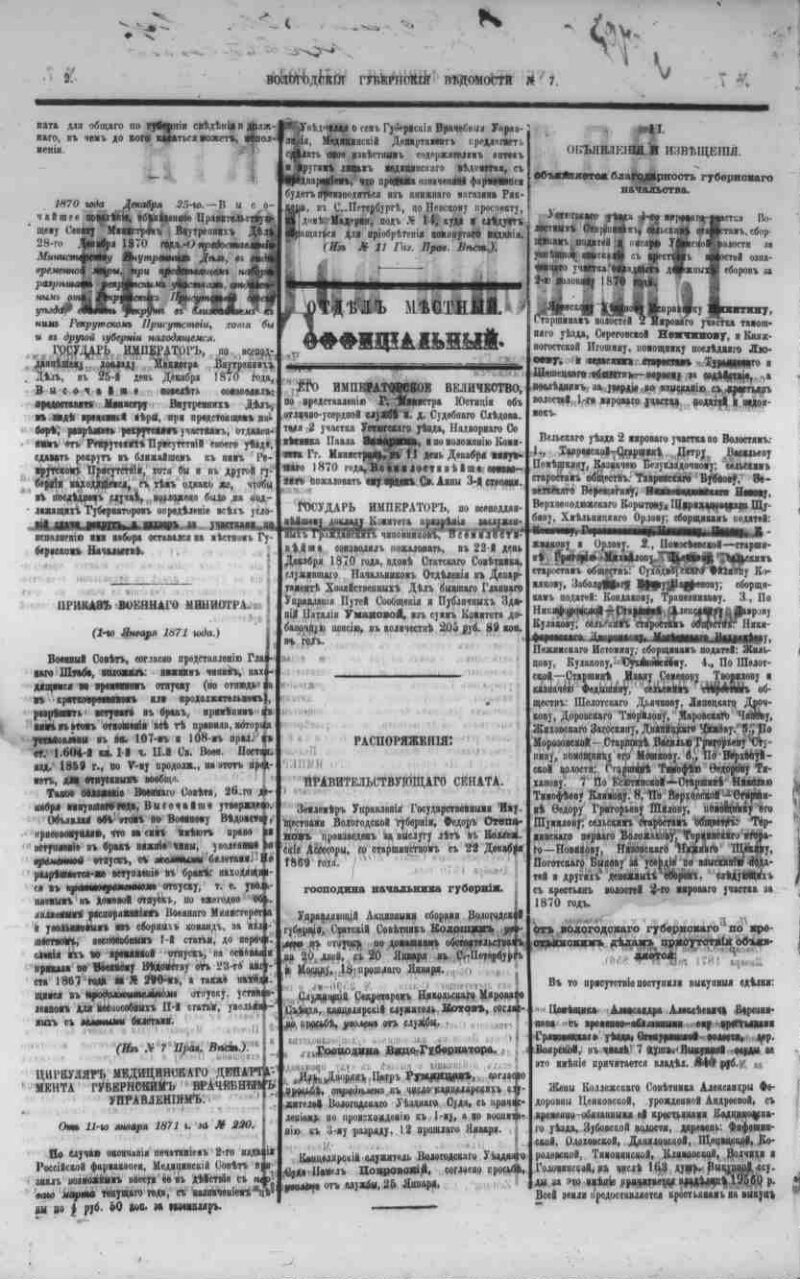 1871, № 7 [6 февр.]. - 8, 4 c. - В номере также: Проект сметы расходов губернских земских сумм по Вологодской губернии на 1871 год