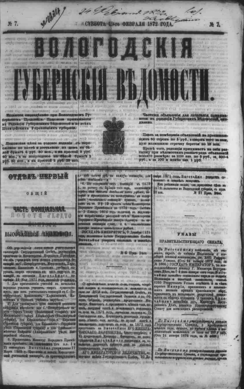 1872, № 7 (19 февр.). - 8, 6, [12] с. - Содерж. также: Прил. к № 7 Вологод. губерн. вед.