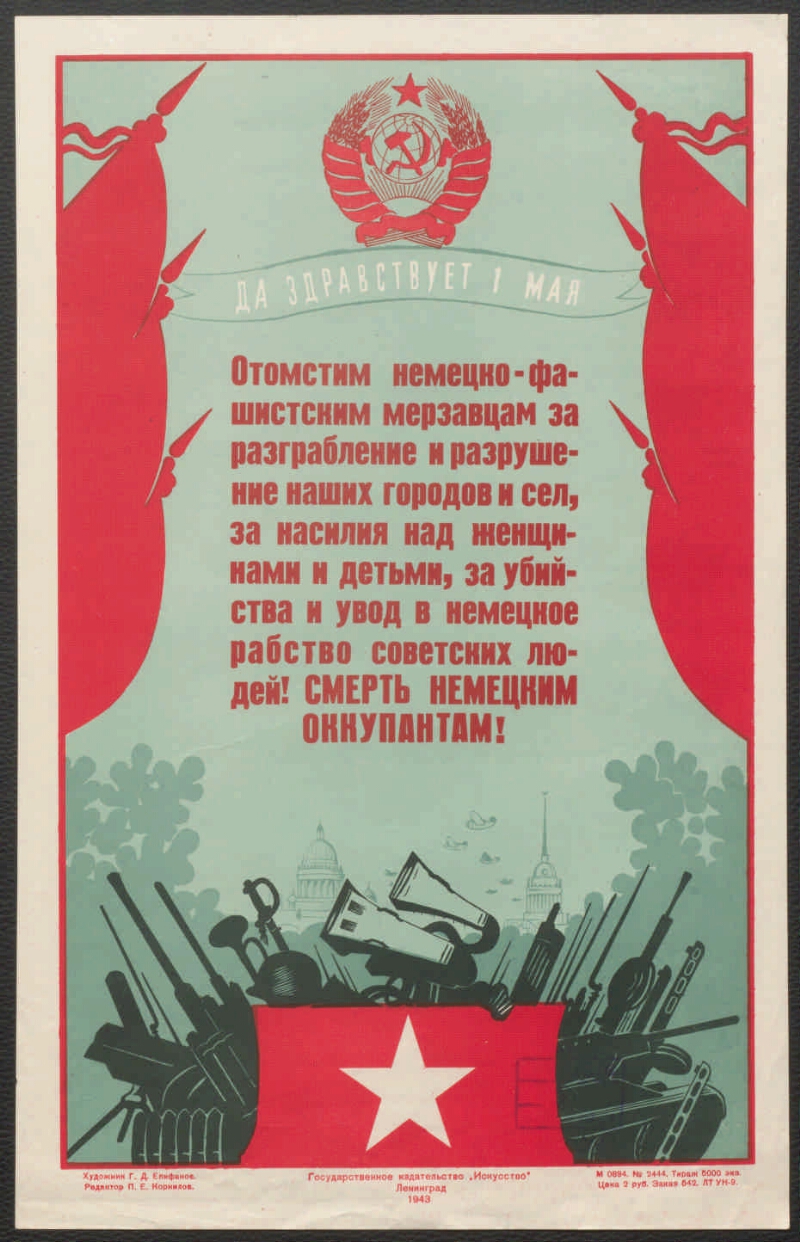 Да здравствует 1 мая! Отомстим немецко-фашистским мерзавцам за разграбление и разрушение наших городов и сел, за насилия над женщинами и детьми, за убийства и увод в немецкое рабство советских людей! Смерть немецким оккупантам! [Изоматериал : электронный ресурс] : [плакат] / художник Г. Д. Епифанов ; редактор П. Е. Корнилов. - Электронные данные (2 файла : 29,4 МБ). - (Санкт-Петербург: Президентская библиотека имени Б. Н. Ельцина , 2015). - Режим доступа: интернет-портал Президентской библиотеки имени Б.Н. Ельцина. Заглавие с экрана. Электронная репродукция плаката: Да здравствует 1 мая! Отомстим немецко-фашистским мерзавцам за разграбление и разрушение наших городов и сел, за насилия над женщинами и детьми, за убийства и увод в немецкое рабство советских людей! Смерть немецким оккупантам! [Изоматериал] / художник Г. Д. Епифанов ; редактор П. Е. Корнилов. Ленинград : государственное издательство "Искусство", 1943. (ЛТ УН-9). 1 лист (11 строк): цветная литография ; 47х30 см. Тираж 5000 экз. М-0894. Изд. № 2444. Цена 2 р. Местонахождение: Российская Академия художеств. Научная библиотека. Копирование пользователями не разрешается.